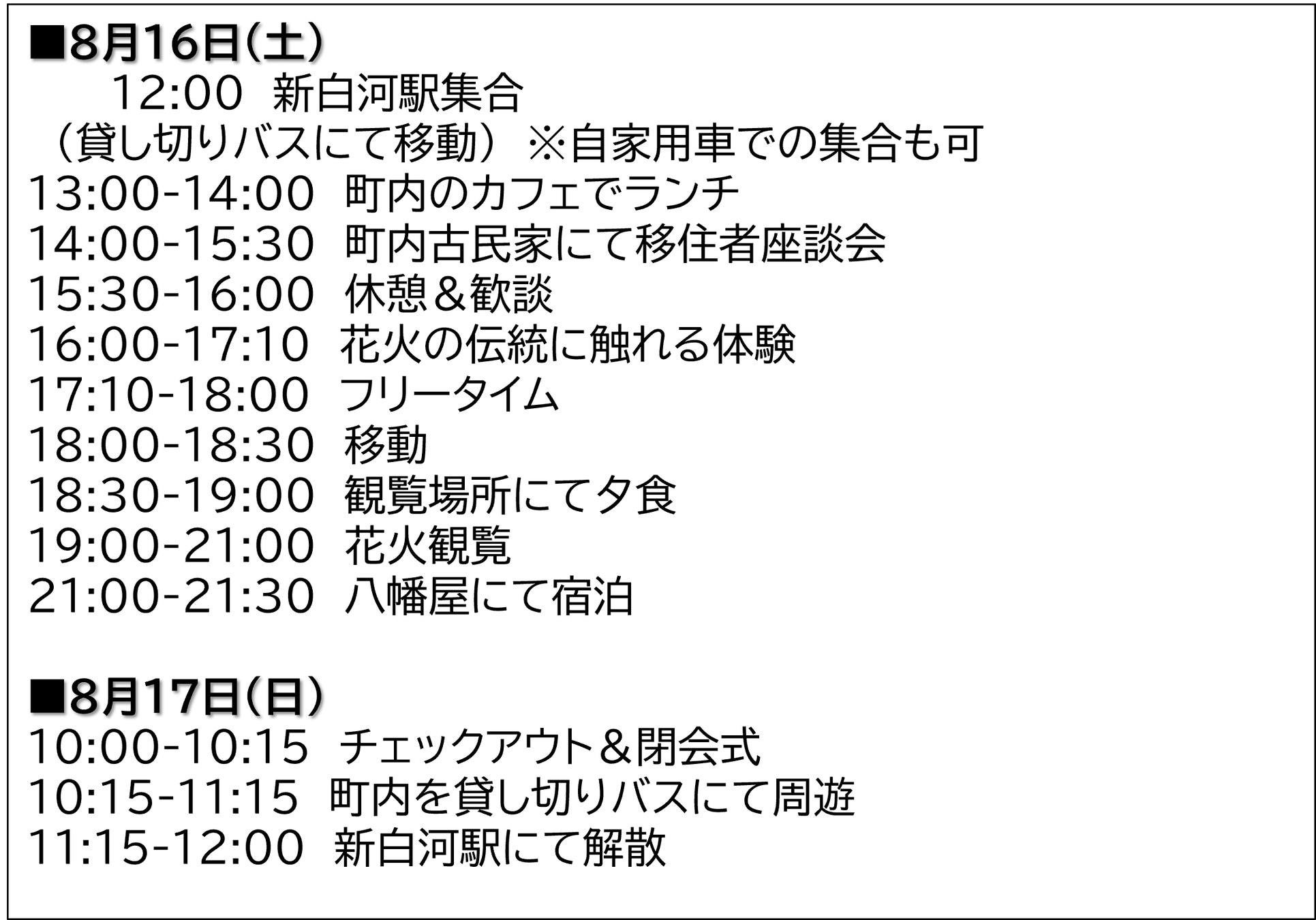 本ツアーでは、首都圏在住の方々に浅川町の魅力を知っていただき、浅川町への興味・関心を高めるきっかけとなることを目的としています。1泊2日の行程では、移住者座談会や花火の伝統に触れるワークショップのほか、夜には浅川の花火を鑑賞いただきます。